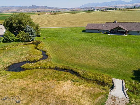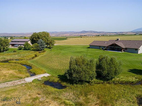 Incredible Montana property w/ a shop and an apartment on 115+ acres on the outskirts of town. The property is truly stunning w/ a year round meandering creek & approx. 3/4 acre stocked pond with a deck. The main home features 4,000 SQFT w/ a 2 car over-sized attached garage. The interior has a spacious living room w/ a fireplace w/ floor to ceiling custom stone work surround, a formal dining room, custom built-in shelving, a grand kitchen w/ ample counter top space, solid wood cabinetry & abundance of storage throughout. You will enjoy the south facing covered back patio w/ retractable awning & views of the mountains. Additionally, the heated shop has approx. 3,000 SQFT w/ a tack room, loafing shed area & add'l attached storage spaces. Above the shop is a 1,600 SQFT self sufficient 2BR/1BA apartment. The land has been meticulously maintained (it looks like a golf course) w/ added landscaping. Much of the land is currently used for hay production with an existing lease.