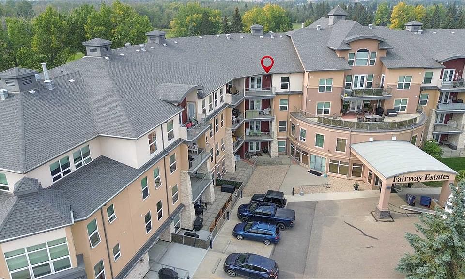 TOP FLOOR CONDO WITH UNDERGROUND PARKING! You'll love this two bedroom, two bathroom unit on the top floor of the upscale Fairway Estates Building, with a great location to the lake. This unit has a view of the lake from the balcony. The unit has a lovely open floor plan with the eat-in kitchen and living room open to each other. The kitchen has extensive cabinet space, gas stove, and kitchen island. The living room has large windows and a fireplace for those cool evenings. The owner's suite is on one end of the unit and has a four piece ensuite. The secondary bedroom/office is at the other side of the unit, with another full bathroom. There's in suite laundry for ease of use. The balcony can fit your patio set and faces the lake. Enjoy parking your vehicle in the heated underground parking spot, which is easy to access. Enjoy the many amenities of this building, including fitness centre, hot tub, theatre room and games room. You're within walking distance to the coffee shops and amenities at the heartbeat of Sylvan Lake. Immediate possession is available.