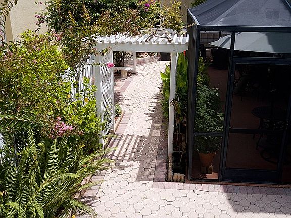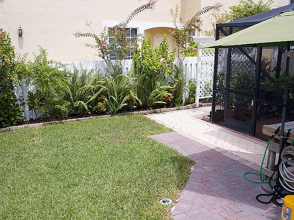 The patio overlooks a serene custom garden you must see to fully appreciate. There is a paver walkway that is lined with tropical plants, plus, there is a custom built water fountain. The perfect place for entertaining or simply to relax. This is a premium lot, one of the largest in the community with privacy fencing and plenty of yard for kids and pets to play.