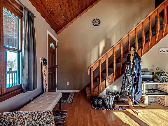 This 4 bedroom, 3 bathroom log-sided home rests on 30+ acres! Tucked away on acreage that adjoins state land, this home provides views of dreamy sunrises and sunsets! The several different heat sources in this home, including a wood stove, propane, and electric, will keep you warm in the winter and the central air will keep you cool in the summer! A large double-stall detached garage with partially heated lean-to's on both sides, walking trails, and a fenced-in area has you covered for any of your animal/pet wants!