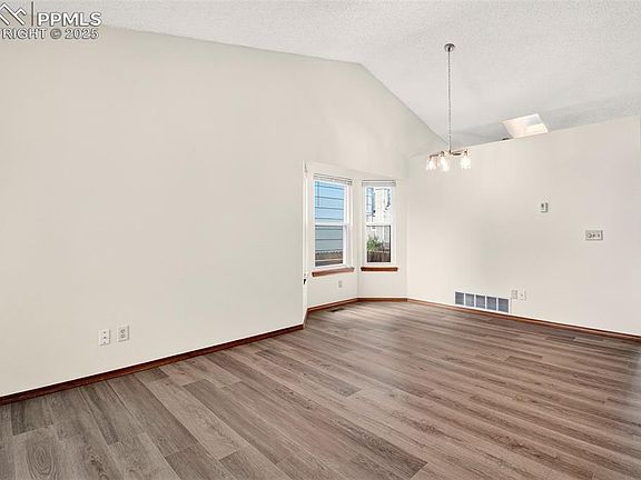 Check this 4 level home out! The landscaping has been updated and new grass is growing in the front yard. The sprinklers are working in both the front and back yard. The interior is freshly painted and has new wood laminate flooring on the main level. The light fixtures have been updated and there is updated countertop in the kitchen. The kitchen features a pantry and a dining nook with skylights to add additional natural light. The living room has a window seat and includes a dining area with a bay window. Vaulted ceilings on the main level have skylights that provide natural lighting to the main level. From the kitchen, enjoy the family room activities. The family room has new carpet, a wood burning fireplace with a blower and a door to the concrete and brick paver patio in the fenced backyard. The laundry and a half bath complete this level. The upper level features new carpet, a primary bedroom with a walk in closet, a window seat, and a full bath. The two additional bedrooms share the full bath off the hallway. Both bathrooms have updated plumbing fixtures and lighting. The fourth level is unfinished making it great for crafting or storage. There is rough-in plumbing for a fourth bath so the basement could have a fourth bedroom, if needed. Close to Powers Blvd with an assortment of shopping and restaurants, and close to an excellent elementary and middle school, this home is just waiting for your buyer!