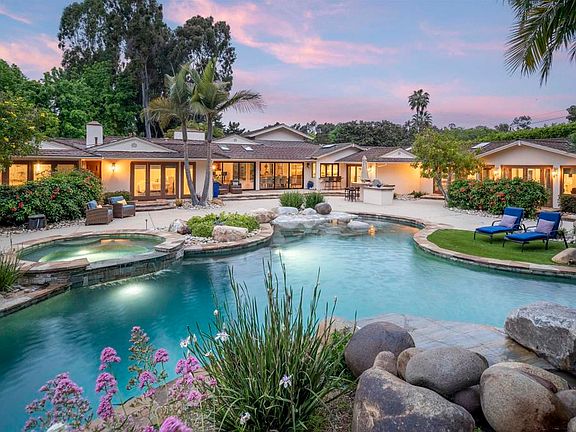 Golden Grove Ranch: A Relaxed Ranch Lifestyle with Farm-Fresh Amenities Welcome to 5041 El Secreto, a serene single-level estate nestled in the prestigious Rancho Santa Fe Covenant. Set on 2.3 acres of impeccably maintained, idyllic grounds, this property blends timeless charm with modern luxury, epitomizing the quintessential ranch lifestyle. Thoughtfully designed for multigenerational living, the estate offers 7,850 square feet of impeccably crafted spaces, including a four-bedroom main house, an attached guest house with two bedrooms, one bath, and a full kitchen, as well as a detached guest house with two bedrooms, a kitchen, and laundry facilities. Additional spaces, such as a generously sized game room and a dedicated home office/gym, further elevate the versatility and practicality of this exceptional home. The newly updated, state-of-the-art kitchen is a chef’s dream, complete with top-tier appliances and ample space to prepare meals inspired by fresh, local ingredients. Complementing the kitchen are 30+ fruit trees, vegetable gardens, and an on-site greenhouse, ensuring farm-to-table freshness year-round. The practical floor plan includes formal and informal dining areas alongside open, flowing spaces ideal for hosting family and friends. Recent renovations include sophisticated new flooring, updated kitchen and baths, custom lighting, new systems, and freshly painted interiors and exteriors, all of which enhance the home’s warm and inviting ambiance. The expansive living areas are bathed in natural light, with soaring ceilings and oversized windows that seamlessly connect the interior to the breathtaking outdoor spaces. The grounds are nothing short of magical, featuring a saltwater pool, spacious patios, mature trees, rolling lawns, and vibrant flowering plants. Every detail has been thoughtfully curated to combine comfort, utility, and beauty, creating a tranquil retreat perfect for relaxation or vibrant entertaining. The all-usable grounds also hold exciting potential for personalized enhancements, such as a vineyard, pickle-ball court, equestrian facilities, or other bespoke amenities, allowing homeowners to craft their dream sanctuary. Meanwhile, the oversized five-car garage offers ample storage and workspace, catering to a variety of needs. The estate is conveniently located in the heart of Rancho Santa Fe, providing easy access to San Diego’s world-class beaches, fine dining, boutique shopping, highly rated schools, and premier medical facilities. With direct access to 60 miles of equestrian and walking trails, this property invites you to immerse yourself in Southern California’s coveted year-round outdoor lifestyle. 5041 El Secreto perfectly balances sophistication and serenity, offering a lifestyle defined by comfort, elegance, and endless possibilities. Disclosures: Photos of the barn, vineyard, and tennis court are virtually designed. Any modifications must be approved by the Covenant Art Jury, San Diego County, and other governing entities.