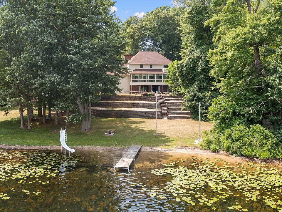 LAKE LIFE AT IT'S FINEST-YOUR CHOICE-YEAR AROUND OR SUMMER FAMILY ESTATE. THIS LARGE ENGLISH-STYLE TUDOR HOME SITTING ON ALMOST AN ACRE WITH 118ft OF WATER FRONTAGE ON LOVELY, PEACEFUL HEMLOCK LAKE-HAS IT ALL. Main Floor features an updated kitchen with granite counters, oak cabinets, walk-in pantry and leads to both dinette & formal dining room areas. The large living room has oak floors, wood burning fireplace and opens out to the full width 3 season deck. In addition there is also a family room & another 3 season room. Bedroom or office with 1/2 bath and laundry are also located on main floor. UPSTAIRS has a PRIMARY BEDROOM SUITE, 2 more bedrooms & full bath. LOWER LEVEL has A PENNY INLAID WET BAR SAUNA with full bath, WINE CELLAR, pool table, wood burning FIREPLACE and WALKOUT to lake Hemlock Lake is 63 acres, all activities, and 75' deep. Located 20 mins off I-94 and 2 1/2 hours from Chicago. Upper A/C replaced. Geothermal forced air. Upper cooled by Central A/C & heated by Geothermal replaced. Sump pump & Well pump replaced. Pool Table incl. Security system & Kinetico water softener. Primary deck replaced. Roof replaced.