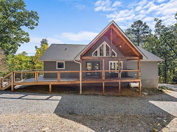 Enjoy seasonal mountain views from the 450-ft gravel driveway. Inside, 8-ft vaulted tongue-and-groove ceilings and a wall of windows showcase stunning Smoky Mountain vistas. The living room offers warm wood floors and a cozy stone gas fireplace, while the kitchen features granite counters, stainless steel appliances, and soft-close custom cabinetry.