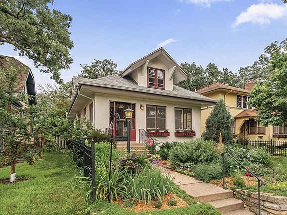 A Nokomis East Charmer! This classic gem is full of warmth and character—from rich woodwork and original maple cabinetry to hardwood floors and beautiful built-ins. The storybook curb appeal is highlighted by perennial gardens, a fully fenced yard, and a paver patio perfect for relaxing or entertaining. The wide front three-season porch invites you in, while the lovely foyer sets the tone with iconic William Morris wallpaper. Main level features a spacious living room, formal dining, two bedrooms (one currently a laundry room—easily moved back to the basement or kept in place for main level living), and a quintessential vintage kitchen presenting a delightful work space. The upper-level suite offers endless flexibility with charming nooks, office space, and a half bath. Clean, dry lower level provides great storage or future finishing opportunity for more space and added equity. A short walk to Lake Nokomis, Minnehaha Creek, coffee shop, dining, library, grocery, and more. Just close emough to the airport for fantastic convenience yet far enough not to be impacted by sound. A delightful blend of timeless style and urban convenience! Plus a new roof in 2023.