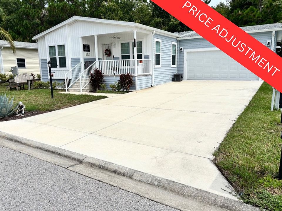 HUGE PRICE ADJUSTMENT TO SELL NOW! This one-owner home, built in 2023, is PRICED TO SELL NOW and is absolutely stunning and ready for its new owner. Nestled on a peaceful wooded cul-de-sac site in the desirable age-qualified, land-lease community of Coquina Crossing, this home truly has it all. When you enter the home, step into the foyer that flows into a versatile den, perfect for an office or additional living space . You will find a spacious great room that seamlessly flows into the open kitchen, featuring a sit-down bar, abundant cabinet and counter space, and a bright dining area-perfect for entertaining or relaxing in the rear of the home. An oversized master bedroom offers a private ensuite bathroom and walk-in closet, while the guest bedroom and bath provide privacy and comfort for visiting family and friends. When you want to enjoy the beautiful Florida weather, relax on your front porch or enclosed screen room and take in the peaceful wooded views. An extended driveway offers ample parking and leads into an oversized two-car garage for added convenience. Coquina Crossing is a gated community featuring Club Coquina, where you can meet new friends and enjoy a wide variety of activities, including Pickleball, Tennis, Bocce Ball, Crafts, a Billiard Room, Ballroom, Library, Fitness Center, Outdoor Kitchen Area, and a beautiful Indoor/Outdoor Pool and so much more. All listing information is deemed reliable but not guaranteed and should be verified through personal inspection by appropriate professionals of Buyer's choice. Resale Home Solutions, LLC cannot guarantee or warrant the accuracy of any information, measurements, or condition of any home, as information was provided by the Seller. Measurements are approximate and should be verified by the Buyer. The buyer is responsible for obtaining all rules and regulations, prospectus, pet policies, and any other information regarding the community from the community management office, as we are not responsible for their fee and policies.
