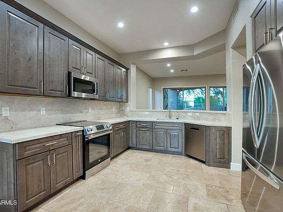 Recently remodeled home in the gated subdivision of Glen Eagles in the heart of Desert Ridge. Home features new cabinets, chiseled stone floors, new stainless appliances, Taj Mahal Quartzite countertops in the kitchen, and fully updated bathrooms. Major components have all been replaced with warranty including the roof, HVAC, and water heater. Backyard is a private space to relax with Canterra stone pavers, gas fireplace, mature trees with no neighbors directly behind you, and a kid or pet friendly splash pad.