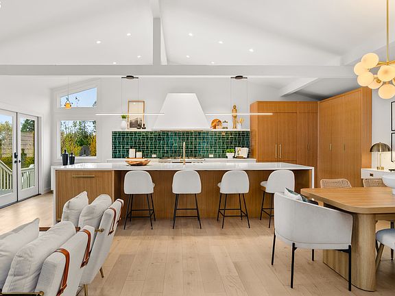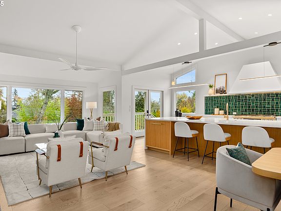 Nestled on a private 0.29-acre lot in Portland’s desirable Wilcox Estates, this recently remodeled mid-century modern home embodies relaxed sophistication and timeless design. Expansive windows fill the vaulted, light-filled interiors with natural warmth, showcasing wood floors and thoughtfully curated finishes throughout. The open-concept great room connects seamlessly to a designer kitchen featuring quartz countertops, an oversized island, Dacor 6-burner range, and built-in 48” refrigerator. Glass doors extend the living space to an expansive deck overlooking the lush backyard—ideal for alfresco dining or friendly pickleball matches on your private court. The tranquil primary suite offers a spa-inspired retreat with Ann Sacks tile, a freestanding tub, and heated floors. The lower level provides exceptional flexibility with three additional bedrooms, a recently remodeled full bath, and a welcoming family room perfect for guests or evenings by the fire. Located within the coveted Wilcox Estates, residents enjoy access to neighborhood tennis courts, a community pool, and nearby parks—all within the top-rated Bridlemile school district. A perfect blend of design, comfort, and community.