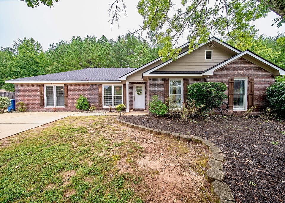 This North Columbus single level brick home is nestled on a cul-de-sac lot in the desirable Stone Creek subdivision. The extra wide parking pad is perfect for multiple vehicles and extends through a double gate to an additional backyard pad complete with a 220V power outlet-ideal for RV or boat. Front entry foyer opens into a vaulted family room featuring a brick wood-burning fireplace and laminate wood floors. The eat-in kitchen boasts tile floor, granite countertops, and a full suite of stainless-steel appliances, with an adjacent laundry room and pantry area for convenience. A spacious bonus room with projector and screen creates the perfect setup for family movie nights, while the formal dining/office space connects through French doors. The owner's suite offers a walk-in closet and ensuite bath with a double vanity, garden tub, and tiled shower. Two additional bedrooms share a hall bath and linen closet. Outdoors, enjoy a back patio for grilling, a wide backyard with two storage sheds, and a fully fenced yard with a separately fenced green space perfect for play or gardening. Additional highlights include gutters, a 2018 water heater, a 2020 architectural roof, and zoned schools: Midland Academy, Midland Middle, and Shaw High.