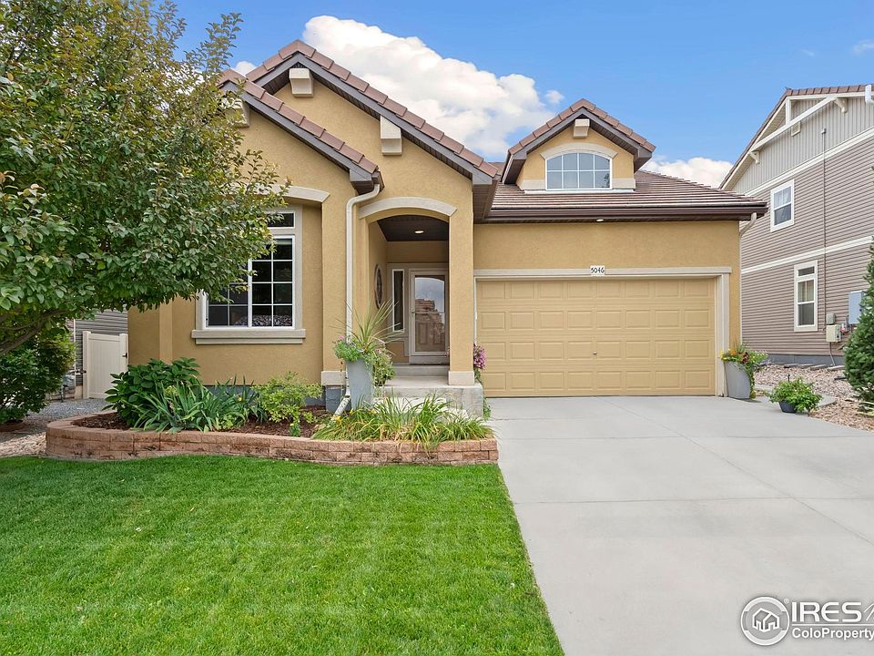 Welcome to this inviting 1.5-story home in the sought-after Thompson River Ranch community. Perfectly positioned with a south-facing backyard and patio overlooking open farmland, this property also offers stunning views of the Rocky Mountains. Enjoy the many neighborhood amenities, including two swimming pools, a disc golf course, a clubhouse/community center with a fitness gym, and more. Designed with convenience in mind, this home features main-floor living with a split-bedroom layout. The primary suite and secondary bedroom are located on the main level, while a third bedroom and spacious rec room are upstairs. The open-concept floor plan includes a gourmet kitchen with granite countertops, large island, gas range and oven, and stainless-steel appliances. The kitchen flows into the dining area and living room, where you'll find engineered hardwood floors and a cozy gas fireplace. Sliding glass doors open to the expansive backyard retreat, perfect for entertaining. Step outside to a beautifully stamped and stained concrete patio with a custom pergola and colorful landscaping. The patio can be accessed from both the dining room and the primary suite, creating a seamless indoor-outdoor lifestyle. Additional highlights include a concrete tile roof, stucco and vinyl siding, and an attached two-car garage. This home offers the perfect blend of comfort, style, and privacy in a prime location.