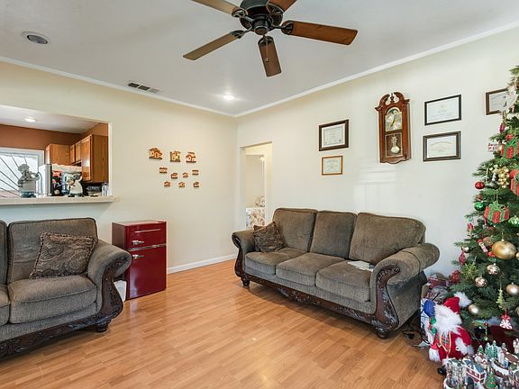 Residing in Commerce is a 4-bedroom, 3-bathroom, 2,049-sqft two-story home with detached 2-car garage that could be the perfect opportunity for you! Happy palm trees greet you as you make your way inside to find laminate floors and double-pane windows throughout, plus central AC to keep you cool and comfortable all year long. The first floor includes a bright living room with recessed lights, a large open kitchen complete with ample cabinetry and counter space, plus three spacious bedrooms. The primary suite offers a walk-in closet, an en-suite bathroom, and sliding door access outside. The nice sized backyard showcases plenty of open patio space that is perfect when entertaining guests. With a private entrance up to the second floor, find a large living room, cute kitchenette with microwave, and a spacious bedroom complete with a walk-in closet and attached bathroom. With its layout, it has great potential for future rental income, if you choose. Electrical Panel was updated recently along with the sub panel in the garage. The A/C is a dual zone system which allows you to control the upstairs and downstairs separately, thus helping to keep your monthly electricity bill lower. Conveniently located nearby the Citadel Outlets, Rosewood Park, Target, El Super, CVS, schools, trucking supply and companies, super easy 710 Freeway access and much more!