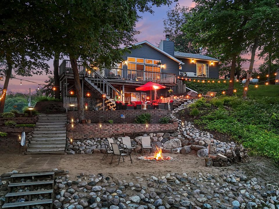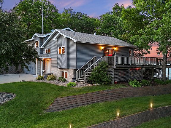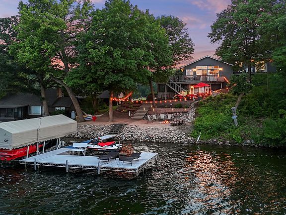 Discover your private retreat on a serene bay of sought-after Pelican Lake. This custom-designed home features 299.3 feet of lake frontage and is surrounded by mature trees for privacy and natural beauty. Enjoy indoor-outdoor living with two decks, a walk-out patio, and stunning sunrises. Main floor open floor plan, two living areas with gas fireplaces for year-round comfort. The lower level offers an additional bedroom, bathroom, and family room. The private primary suite is a sanctuary with its own deck and panoramic lake views. Entertain easily from the spacious kitchen and living area that flows outdoors. Additional perks include a 2-stall garage, walk-out lower level, landscaped patio, and sand terrace—perfect for bonfires, hammock naps, and lakeside play. Ideal for weekend getaways or year-round living, this hidden gem offers the best of Pelican Lake. Agent related to owner.
