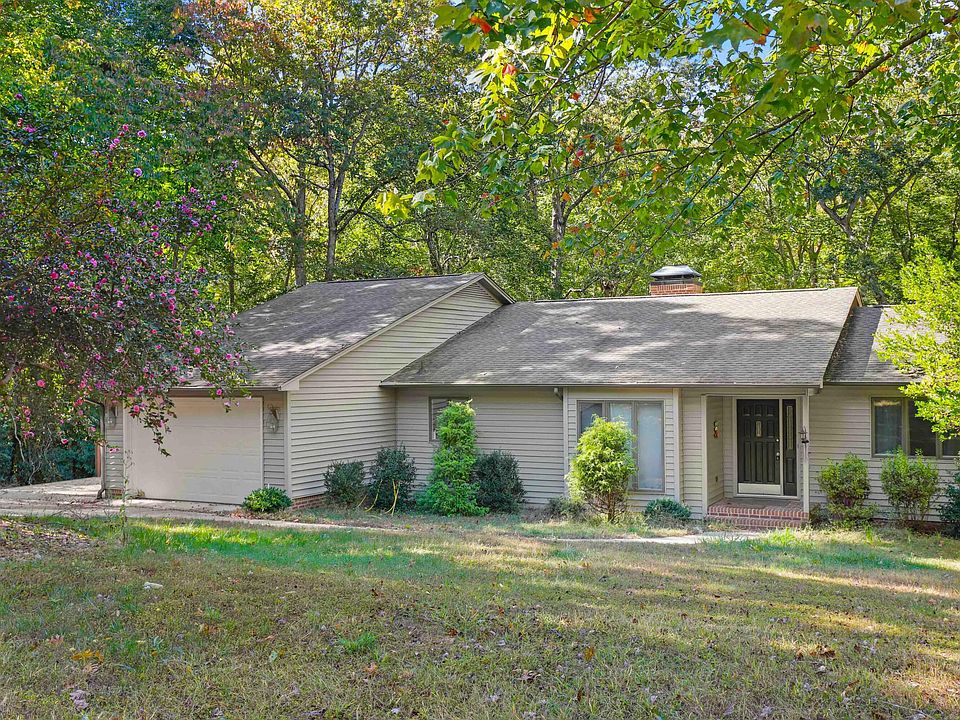 Welcome to 5047 Bluebird Dr, nestled in the serene, gated community of Carolina Trace. This charming one-level home sits on a beautifully wooded 0.34-acre lot, offering privacy and peaceful surroundings. Step inside to find a thoughtfully designed layout featuring a cozy fireplace that connects the spacious living area to a bright and inviting sunroom — perfect for enjoying your morning coffee or unwinding after a long day. The kitchen and dining areas provide great flow for entertaining or everyday living, and large windows bring in natural light throughout. A standout feature is the unfinished basement, providing a blank canvas for storage, a workshop, or future expansion. Outdoors, enjoy the tranquility of nature from your deck, and take advantage of all that Carolina Trace has to offer, including a community pool and lake access, plus close to shopping, dining, and more!