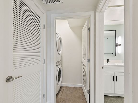 Modern shaker-style cabinetryWaterfall quartz countertopAmple countertop spaceUpscale finishesStackable washer and dryerStainless steel appliances