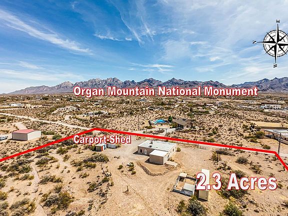 Located minutes from the stunning Organ Mountain National Monument in the Talavera area. Recent improvements include a new elastic roof and coating, fresh exterior paint, new garage door with remotes, and an added exterior garage door. Inside, enjoy new bedroom flooring, an updated bathroom with a walk-in shower and modern vanity. New window in the primary bedroom. This 3-bedroom, 2-bath home offers 1,750 sq ft of open-concept living on 2.3 acres. The remodeled enclosed sunroom offers year-round enjoyment, and a new porch adds curb appeal. Additional upgrades include a new security system, fencing, new spigots and shutoff valves, leveled areas around the home, and a repaired main water line. Surrounded by natural beauty with beautiful sunrises and sunsets. This move-in-ready home offers comfort, privacy, and access to outdoor adventure just outside your door. UP TO 6 HORSES ALLOWED!