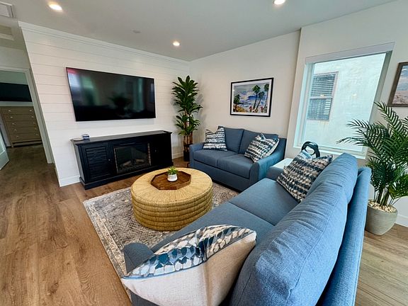 The overall apartment is bright and airy with gorgeous luxury vinyl plank floors throughout. The living room is furnished with two comfy custom love seats, a cozy electric fireplace that throws nice heat or can be used without heat to create a lovely ambience year-round, a 65" Samsung Smart TV and a sweet bistro table with two chairs to enjoy your morning coffee. A 9' wide multi-panel sliding door off of the living room offers the best in indoor/outdoor living as a gateway to a large private patio. Dine al fresco at the patio dining table while grilling up something tasty on the Weber gas BBQ grill.