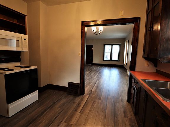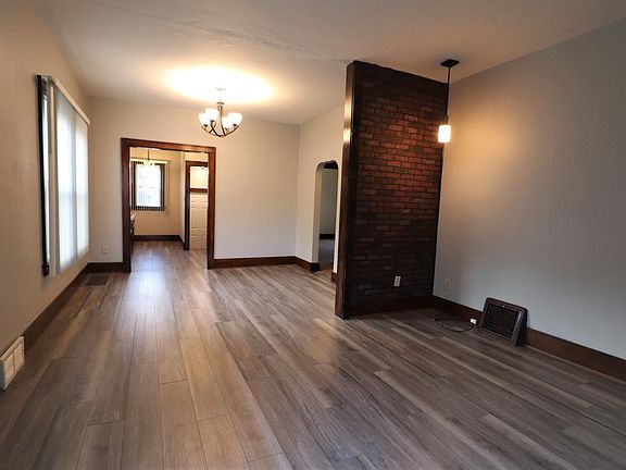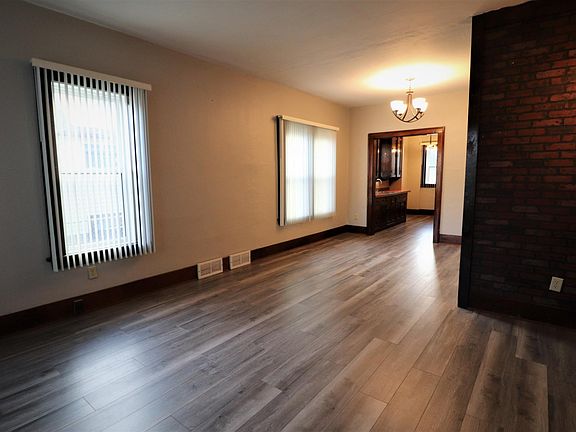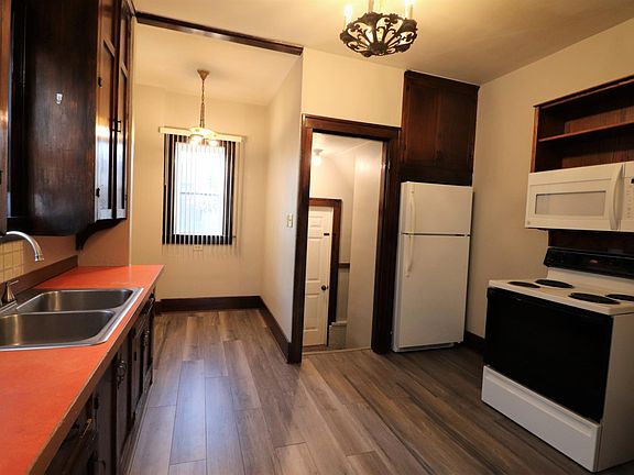 The classic decor' of this home's is complemented by wide woodwork and tall ceilings. The living room, dining room, and kitchen flow together with rich wood-tone flooring that extends throughout this large opened area. The kitchen is equipped with vintage cabinets, electric range/oven, fridge, microwave/hood, and features a cozy breakfast nook that is perfect for a small bistro table. Both of the main floor bedrooms are comfortably sized with carpeted floors. The bathroom features a newer vanity with quartz top with underlay sink, tub/shower, and a traditional ceiling fan. The full unfinished basement offers additional clean usable space with laundry hook-ups. Heating and cooling is made easy with this home s newer natural gas furnace and central air conditioning systems. This is a very nice comfortable home and is ready for immediate occupancy.