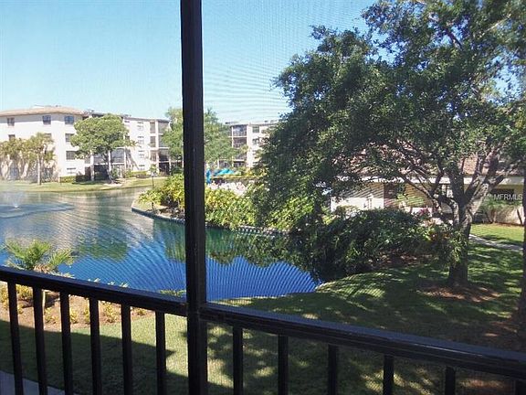Beautiful newly painted 2nd floor condo overlooking lake and clubhouse and pool and huge fountains in the background. Covered Parking. This is a corner unit where the building jogs back so more privacy. Screened porch overlooks beautiful views and sound of the fountains. Being sold furnished (but not turnkey). Building has elevator and this unit has an indoor washer/dryer. This unit has had a lot of TLC and is in really good condition. Pretty molding installed around beds in both bedrooms. Hiking paths around lush green landscaping. Heated community pool and Recreation center is right behind this unit. Shuffleboard courts. Gated community near shopping.