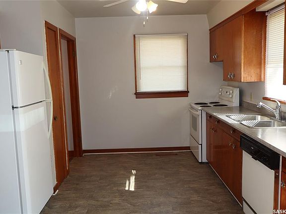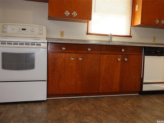 Located in Assiniboia, this upgraded family home features an open kitchen and living room with laminate flooring and ample natural light. There are two bedrooms on the main floor, plus a basement bedroom and two dens (convertible to bedrooms). The home offers generous storage, including a large basement room. Appliances upstairs are updated, and the basement includes a new washer and dryer. Exterior updates include vinyl siding and replaced shingles. The property has a carport for convenient parking and a fenced backyard.