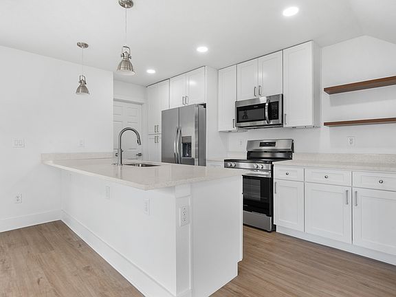 Stylish and spacious first floor: Step inside to wood-like flooring and an open layout that seamlessly connects the living and dining areas. The gourmet kitchen boasts white shaker cabinets, quartz countertops, a large island, and stainless-steel appliances including a range, refrigerator, microwave, and dishwasher. Just off the kitchen, a dedicated laundry room with washer/dryer hookups adds everyday convenience.