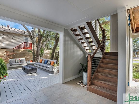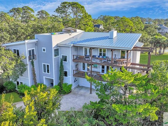This exceptional Tybee Island home was custom designed to optimize privacy and views. The main level features a greatroom with soaring ceiling and large kitchen/ dining area with banks of cabinetry, quarts counter tops, high end appliances, walk through pantry and a pass through fireplace between the dining area and greatroom. 2 bedrooms on the main level are connected by a Jack and Jill bathroom with privacy for each. Up one level is the Owners suite offering incredible views and solitude. The owners bath has 2 vanities, a soak tub and separate shower. The custom closet area has a large built in bureau and walk in closet. Down the hall is the large office/ exercise room plus library with fireplace that opens to the greatroom below. Both the main and top level have covered porches. Up one more flight of stairs is the private roof top deck with hot tub. The ground level features a rec room off the deck with built in seating and surrounded by live oaks and a 2 car garage.