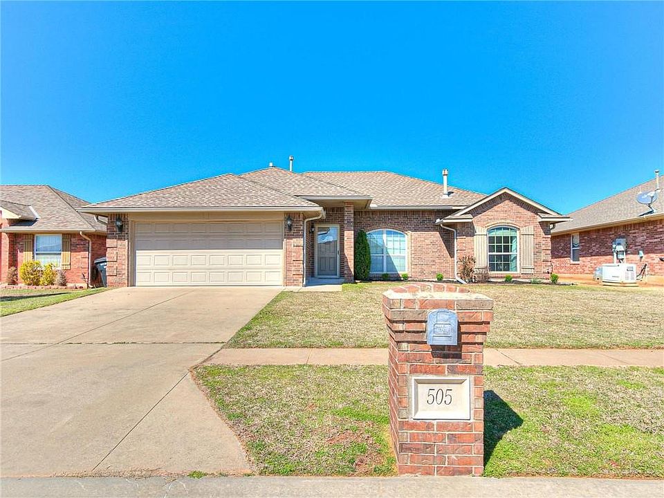 Welcome to Apple Valley in Moore schools with walking trails, neighborhood park, pavilion & splashpad! Updates include: Paint 2023, Roof 2015, AC 2019, Fence 2018! Storm Shelter in gar! This 3/2/2 home boasts wood look tile flooring throughout the entry, living & hallways! Spacious living room with attractive stone fireplace & oversized arched front window. Roomy kitchen with extensive granite countertops, wood stained cabinets, nice sized pantry, stainless steel appliances, a new faucet, undermount sink & a large window overlooking backyard. Split plan provides a private Master bedroom that easily holds a king size suite w/ a generous walk-in closet & ceiling fan. Master bath has dual vanities, oversized shower, & separate garden tub. Two addt'l bedrooms each feature oversized closets. Built ins in the hallway next to a full hall bath which separates the bedrooms. Large backyard w/ full guttering, an oversized covered patio with extended concrete. A must see!