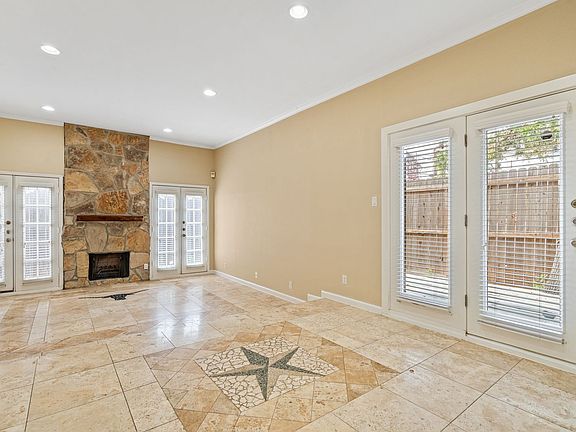 Custom stone fireplaceHuge side patio deckImported travertine tile