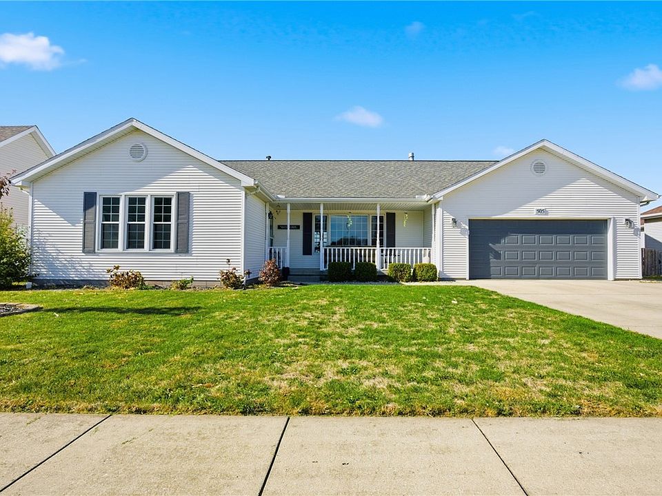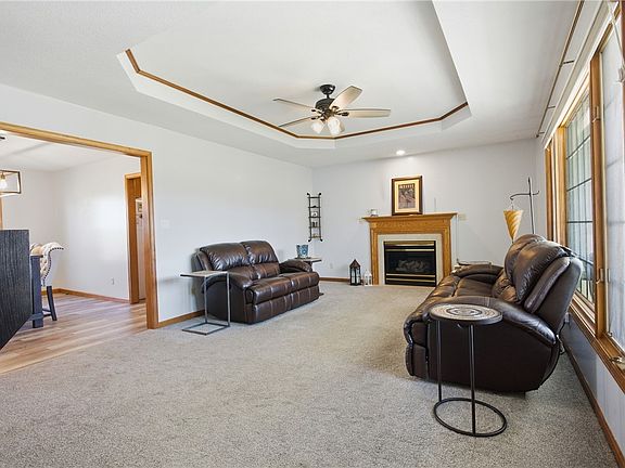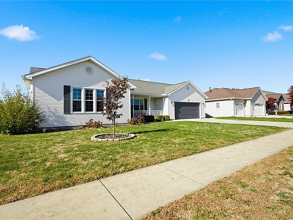 As you enter, you'll first notice the nicely sized front porch, perfect for enjoying your morning coffee or relaxing in the evening. This residence boasts nearly 1,800 square feet of comfortable living space, featuring three spacious bedrooms and two and a half baths. Step inside to be greeted by a generous living room with a tray ceiling plus a cozy gas fireplace, perfect for colder evenings. The large bay window floods the space with natural light, creating a warm and inviting atmosphere. The dining room is adorned with sleek laminate flooring, seamlessly flowing into the kitchen. The kitchen features white appliances, beautiful oak cabinetry, and a substantial island that provides ample space for meal preparation and gatherings. Step down into the sunken family room, which has been upgraded with newer laminate flooring. This cozy area is conveniently adjacent to the laundry room and the half bath, offering ease of access for daily living. The home’s three bedrooms are all generously sized, with the master suite being a standout feature. It offers an oversized layout complemented by a walk-in closet and a master bath equipped with a modern walk-in shower. The backyard is an entertainer's dream, featuring a large deck that surrounds an above-ground pool, along with a cozy fire pit area for gatherings under the stars. The two-car attached garage is not only spacious but also includes a mini split unit for heating and cooling, ensuring comfort year-round. This home boasts several recent updates, including a furnace and AC unit (both installed in 2017), a brand-new hot water heater (2024), and an updated mini split in the garage (2023). Additionally, all flooring throughout the home, including laminate and carpet in the bedrooms and living room, has been newly installed. Solar panels are included and are PAID off with the electric bills costing around $8.00 per month/warranty transferrable. This ranch home combines comfort, style, and functionality—schedule your visit today to explore all this fantastic property has to offer!