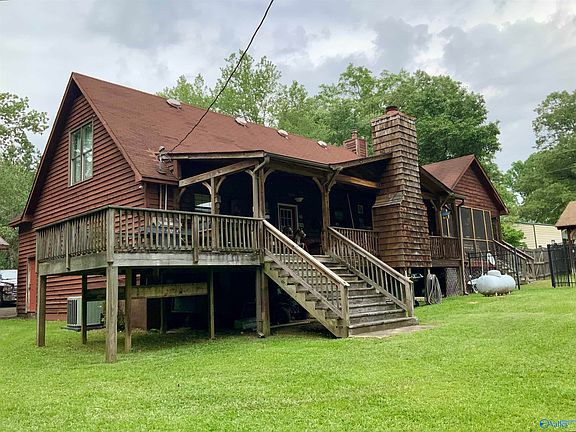 The picturesque setting of this lovely waterfront home boasts a casual flair with a wraparound front porch & backyard oasis featuring multiple porches, outdoor fireplace AND in-ground swimming pool. Large enough for family gatherings this custom lake home offers an open floor plan & soaring greatroom ceilings with a stone fireplace & bamboo floors. The kitchen is spacious with a butcher-block island. It has two main level bedrooms PLUS a versatile loft & upper level guest suite. The home offers a workshop garage, detached carports & a storage shed. The easy walk to the dock & fishing pier with the 2003 Bentley 24ft pontoon included create the ultimate Weiss Lake lifestyle!