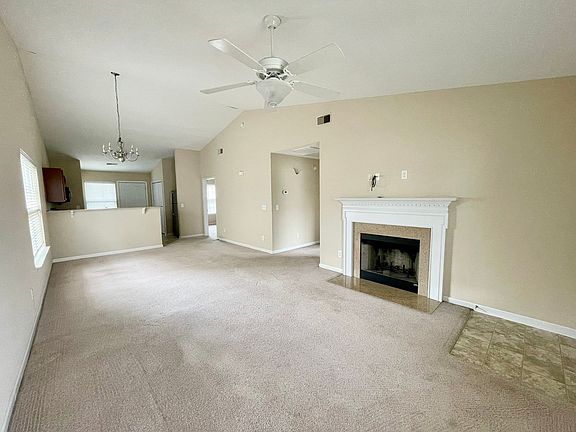 Decorative fireplaceCarpet flooringFenced-in back patio