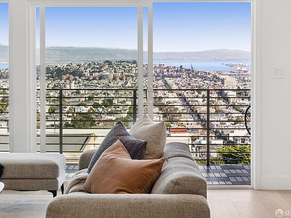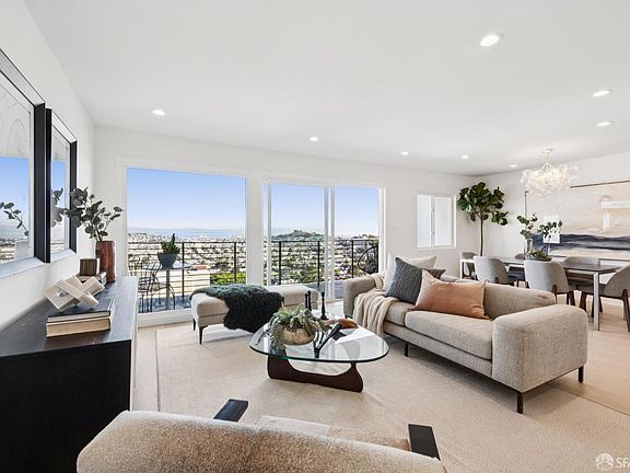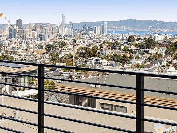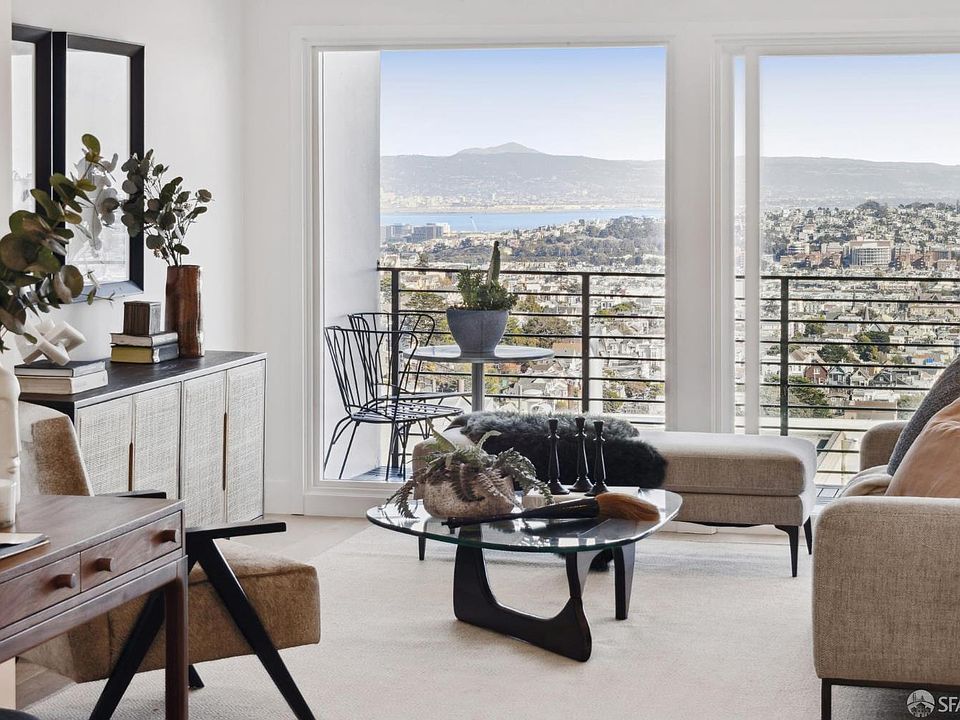 Amazing panoramic views from this top floor flat in a boutique mid-Century Noe Valley location. With new sliding doors to a private deck, relax and enjoy views for miles from downtown San Francisco to over the Bay & Mount Diablo. Gorgeous new kitchen with lots of sleek cabinets, quartz counter tops and new stainless appliances. Dine at a large kitchen island or in the spacious, open plan living/dining room with those views! The primary bedroom has a beautiful ensuite bathroom with tub and shower and a newly remodeled second bathroom offers convenience for guests. Designer bathroom tiles, new wood floors, in-unit laundry hookups, new gas furnace, recessed LED lighting and new skylights make this a perfect, move-in ready home. Completely remodeled, top-to-bottom, the building is rock solid seismically, has a new roof, new plumbing and electrical systems and new dual pane windows throughout! One car parking with interior access is included, plus storage!