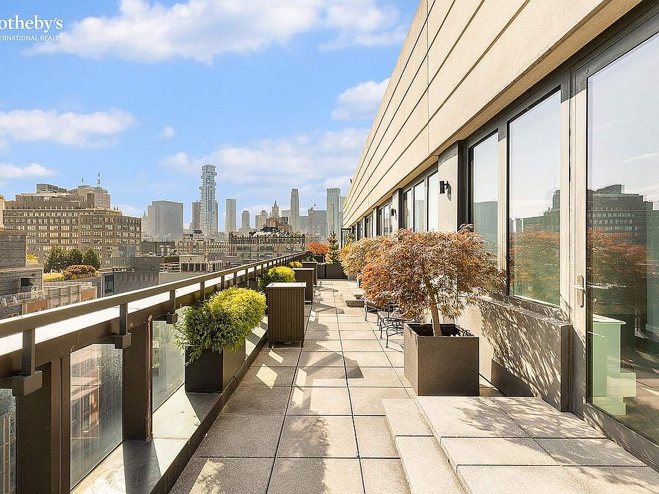 Exceptional West Soho/Hudson Square Penthouse with dramatic city views and a 50ft long, private, landscaped terrace. With terrace access from both the living room and primary bedroom suite, this two-bedroom, two-bath condominium is ideal for entertaining and for those who crave the outdoors. A gracious foyer leads to a spacious living and dining area with an open kitchen. The kitchen is outfitted with top appliances (Viking, Sub Zero, Bosch) and offers abundant storage and work space. The Primary Bedroom Suite is generously proportioned and includes an indulgent, windowed marble bath complete with Zuma soaking tub. There are two closets (one a walk-in) within the bedroom. A large second bedroom with a walk-in closet, a full second bath, and a laundry room/utility closet complete the offering. The unit has east and west exposures.