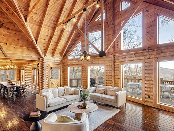 The main living room is flooded with natural light through large upstairs windows and features vaulted ceilings, adding to the cabin's open and airy ambiance. Stock the gourmet kitchen easily with convenient grocery shopping nearby or explore the vibrant dining and entertainment options in Downtown Asheville, just under ten minutes away.