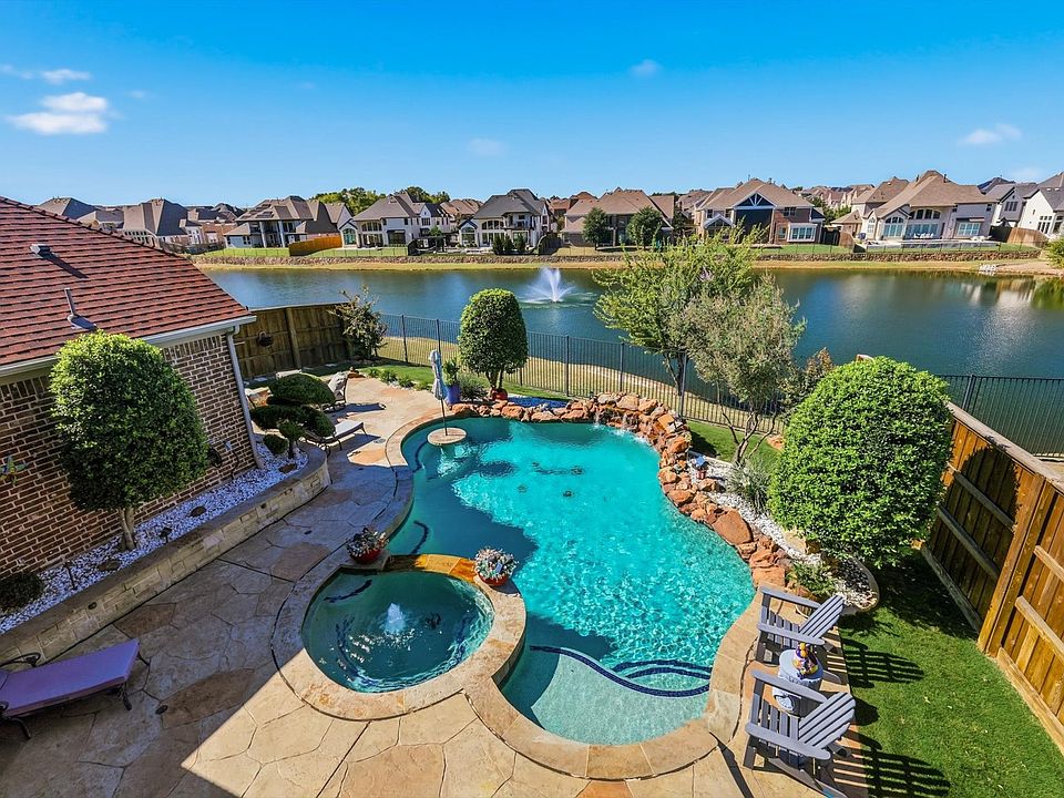 Exclusive, East Facing, Lake Front Living Opportunity! ONE OF A KIND! Dream Backyard, Created For Ultimate Entertaining! Panoramic Fountain View on the Lake with a Heated, Resort Style Pool and Jetted Spa. Rock Waterfall, Pool Bar with Table & Umbrella, Stamped Concrete with Oklahoma Slate Stone Coping, Lighted Walkways, Cedar Pergola with Party Lights, Two Outdoor Ceiling Fans, Built-in Angus Bull Grill, Outdoor Mini Frig, Guest Seating, & Landscaped Grounds with Sculpted Trees. Access to the Stocked Catch & Release Lake. Enjoy Peaceful Mornings Watching Ducks & Geese While You Savor Your Favorite Drink. This Setting Delivers Serenity That is UNFORGETTABLE! You Will Not Find a Backyard Like This One!