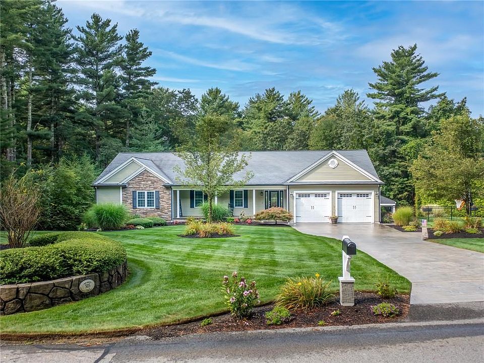 HOME for the Holidays! Sprawling custom-built executive-style Ranch perched on almost 14 acres of land, with a portion located in North Smithfield! Once inside, you will discover an enormous open layout with cathedral ceilings, an extraordinary kitchen featuring professional-grade stainless appliances, gleaming quartz counters, and exquisite cabinetry. The home also offers 3 oversized bedrooms and 3.5 bathrooms with magnificent tile work, abundant closet space throughout, a full walkout finished basement, and a 2-car garage with dual entry. If the interior isn’t enough, the exterior amenities are truly exceptional. Enjoy an inground saltwater pool with an attached hot tub, surrounded by custom stonework. Adjacent is a luxurious bath house complete with a full bar and grilling kitchen island, bathroom, and a TV area with fire table and mounted TV—perfect for outdoor entertaining. Relax on the stamped concrete 15x6 farmer’s porch overlooking the professionally landscaped yard with sprinkler system, gather around the spectacular oversized stone outdoor fire-pit, or dine on the large composite deck or lower custom patio area.