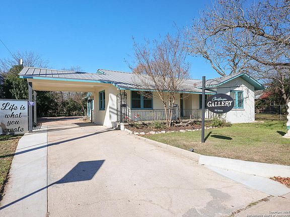 A fantastic spot for a business or a residence. Zoned R-5 so can go either way. Located just one block north of the beautiful Blanco downtown square, this 1947 pier and beam home was lovingly renovated from June 2022 to January of 2023. Its location, history and renovated beauty make it a one-of-a-kind opportunity! This 1408 square foot home has a 5-year-old metal roof which was newly reframed with 4 x 8 framing and blown insultation, and the attic space has an HVAC deck with new HVAC system (in and out) and new duct work. All sheetrock walls and ceiling have been replaced as well as all plumbing and electrical and a new electrical box. The home has restored original hardwoods. The bathroom, main entry and the kitchen were fully gutted and rebuilt to include new plumbing and electrical, tile flooring and new appliances. The original front door and wrought iron railing hugging the original front porch are restored and original to the house and perfect for outdoor seating, a porch swing or rocking chairs. A custom tall wrought iron gate has been added for front porch privacy. The side entrance and main double doors entrance are new with decorative wood/glass and iron installed doors installed January of 2023. The building includes a sound system with adjustable volume for each room and the outside patio area. A theater room is installed that includes a projection system, its own sound system and projection screen. A new security system is in place and can be established. A new 10 x 10 storage shed was built in 2023 and the back lot cleared and converted into parking for up to eight vehicles. A Custom deck and custom fencing are installed in the back at the main entry to the house as well as a porch and handicap ramp. The home includes a new 10 x 10 main entry with pass through hall leading into the house or to the fully restored kitchen. Off of the kitchen is a 10 x 13 room with an original built-in and a new entry door. This room is full of light and could have many uses such as an art studio, office space, or storage. The full house has vintage picture rails (which look like crown molding) installed to easily hang art. The main rooms of the house include the original dining room with original build in china cabinet and large windows. A large living room with seven windows for plenty of light and a fireplace with side storage (original to the house and in great condition). The fireplace is currently closed off so nonfunctioning but very beautiful and a great place for a candle display or for conversion to a working fireplace. There is a fully renovated bathroom with a new custom sink and toilet and two additional rooms measuring 12 x 17 and 13.4 x 12.8. A new Instant heat electric hot water heater has been installed. Numerous spotlights and directional lighting throughout the building. Beautiful custom hand blown blue glass light fixture in pass through hallway from Wimberley Glass Works. Glass Doorknobs on interior doors. Twenty-two windows provide tons of natural light. Frosted glass pocket doors on storage room, kitchen, and Film room. Beautiful mature pecan tree in front yard, established rose bushes and crepe myrtle trees and custom car port pass through into back parking area. The building is fenced on three sides (except street side). The historical character has been carefully maintained while updating this home into what could be a multi-functional space. Office, Art Gallery, Restaurant, Home or VRBO (subject to city approval). Currently zoned R5 which is residential/commercial transitional. City Water, PEC Electric, Hill Country Wireless internet. Low heating and AC bills due to exterior cement and plaster walls and lots of insulation. The history and character of this home make it a very unique piece of real estate that speaks of a past era with modern conveniences