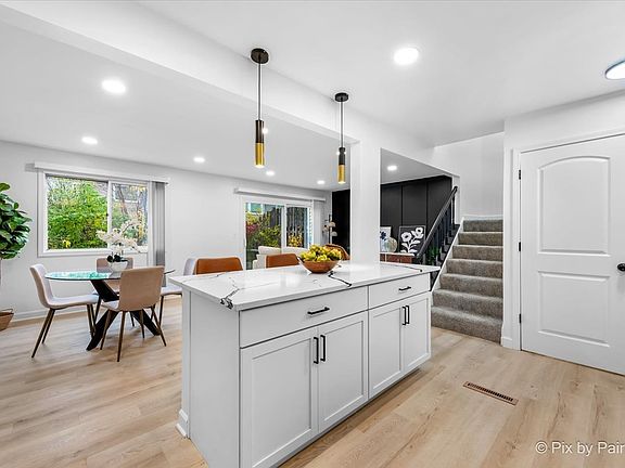 You'll appreciate the attention to detail in every inch of this beautifully remodeled 3 bed, 1.1 bath townhome with full finished basement. Stunning, open concept eat-in kitchen with new cabinetry, ss appliances, quartz counters including a sizeable breakfast bar, custom tiled backsplash and gorgeous LVP flooring that extends throughout the home. Adjacent dining area, living room with feature wall and sliders leading to a private patio and upscale powder room complete the main level. Upstairs is a spacious primary bedroom with dual closets, 2 additional bedrooms and a renovated full bath with high end finishes and custom tile work. The finished lower level features a huge family room, laundry room and ample storage. Attached garage. All new cabinetry/vanities, appliances, lighting, flooring and paint. Ideal location near parks, hiking and biking trails, The Promenade, shopping/restaurants and 355.