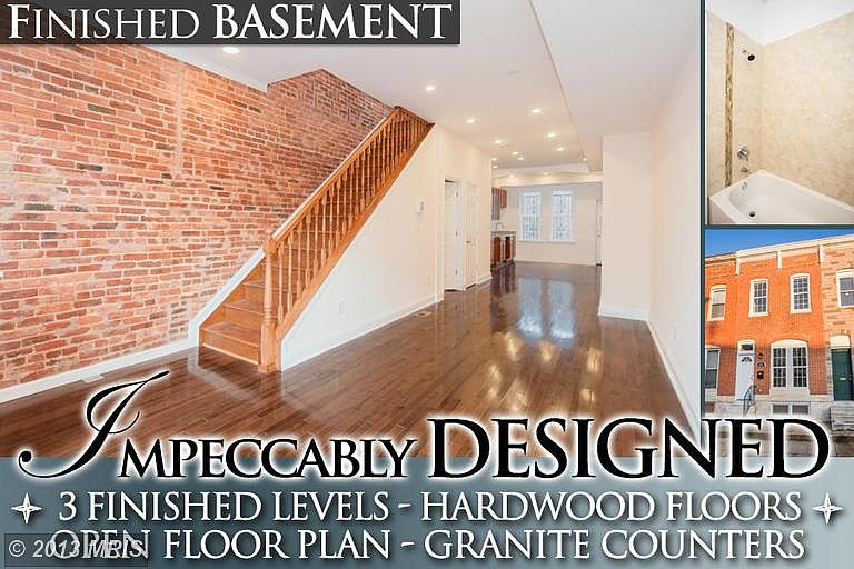 IMPECCABLY DESIGNED ROWHOME WITH CHEFS KITCHEN & 3 FINISHED LEVELS! Hw floors throughout, spacious LR w/ exposed brick, dining area, main level half bath, Chef's kit w/ granite counters & ss appliances (to be installed), upper level w/ Master suite w/ full bath, 2nd bedroom w/ hall bath, & 3rd room that would be perfect for office/den. Finished basement w/ family room, full bath, & 3rd bedroom