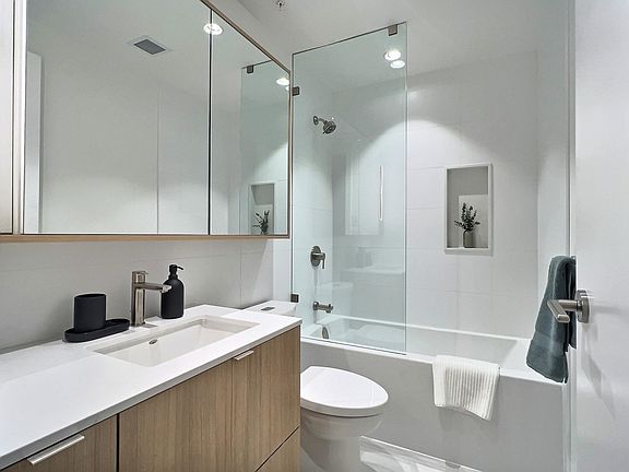 WEST ~ 397sq ft studio. Ideally located, perched atop a hill at west, you can enjoy water or mountain views from every floor. Upscale kitchen experience with high-performance, integrated Fisher & Paykel appliance package for gourmet cooking. West's homes also include energy-efficient air conditioning and smart thermostats. The thoughtfully crafted interiors include ceilings up to 9' and floor-to-ceiling windows, optimizing light and openness and are made with high-performance glass that enhances views. Includes Fridge, gas stove, dishwasher, washer, dryer, AC (heat pump), 1 parking and 1 locker. Building Amenities include: Fitness center, yoga area, guest suite, outdoor lounge with BBQ, sports court, kids playground and green space. Small pets ok w/ deposit. 1 Year Lease. 13th mont