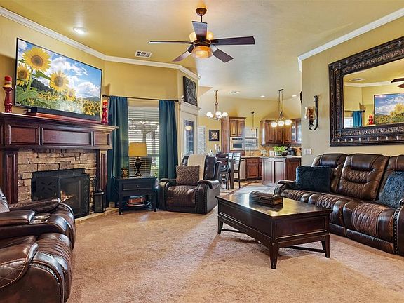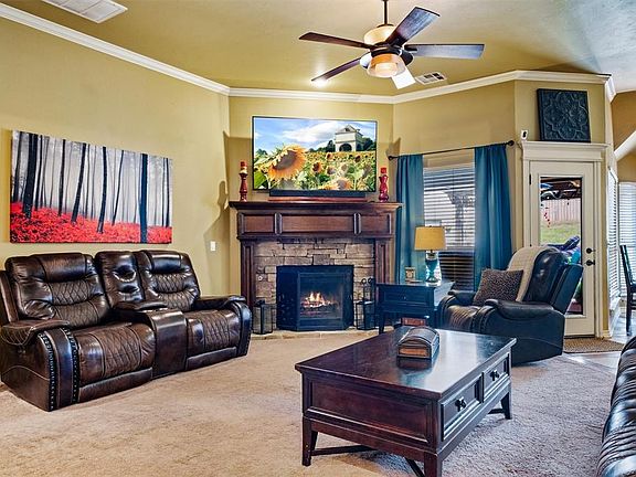 The three-car garage includes an F5 above ground storm shelter as well as a convenient pass-through to the backyard. The outdoor space is designed for both relaxation and entertainment, boasting a sparkling pool with decking, a covered back porch, and a beautifully crafted pergola that offers additional shade. There’s even space to hang your TV, making it an ideal spot for unwinding and enjoying your leisure time. This home blends comfort, style, and functionality, making it a must-see for anyone looking to settle in a desirable neighborhood. Welcome Home!