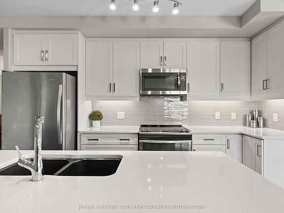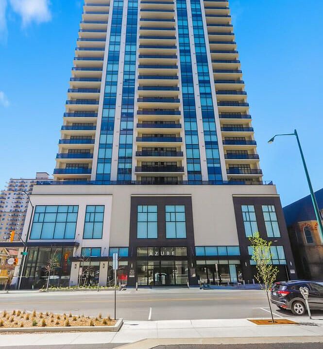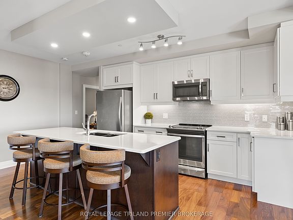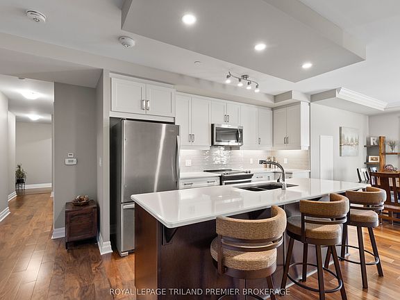 Stunning 2-Bedroom + Den in the Desirable Azure Building, Downtown London. This spacious corner unit offers breathtaking north and west views, filling the home with natural light throughout the day. Step through the front door into a generous foyer leading to an open-concept living space with gleaming hardwood flooring and custom window coverings throughout. The upgraded kitchen features stainless steel appliances, quartz countertops, tiled backsplash, and an island with a breakfast bar-perfect for entertaining. The adjoining dining area provides balcony access, and the bright great room is highlighted by a modern fireplace with a stylish tiled surround. The unit includes two generous bedrooms, including a luxurious primary suite complete with two walk-in closets and a spa-inspired 5-piece ensuite boasting double sinks, a tiled glass-enclosed shower, and a relaxing soaker tub. The den offers versatile flex space ideal for a home office, guest room, or cozy family area. A second full bathroom and in-suite laundry add everyday convenience. The Azure Building provides exceptional amenities, including a fitness centre, golf simulator, library, rooftop patio with BBQs, and numerous inviting lounge and entertainment spaces-perfect for hosting gatherings. Enjoy secure building entry, an owned locker located on the same floor just steps from the unit, and one underground parking space. Centrally located in the heart of downtown London, you're just steps from parks, public transit, cafés, restaurants, and all the vibrant energy the city's core has to offer.