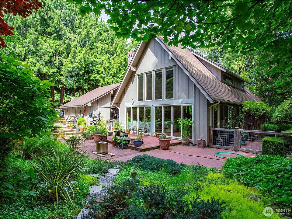 A rare, precious oasis for those who value wildlife, forests, peace, privacy and tranquility. This 1651 sq ft, 3-bed, 1.75-bath mid-century home in a lush setting features include a soaring glass wall, new oak flooring, and a vaulted living room with a gas fireplace opening to two sunny patios. The kitchen boasts warm cabinetry and new appliances. The ground floor offers a bedroom with a remodeled ensuite bath. Upstairs, a unique loft primary bedroom or office/guest room with ensuite bath. Enjoy three outbuildings: a carport/shed, an insulated home office shed, and a screened garden house. Plus, an outdoor kitchen, greenhouse, and a vegetable garden with a sundowner platform. Direct gate access to greenbelt, offering easy/pleasant walks.