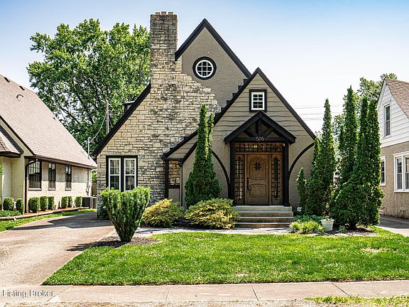 Welcome to a timeless treasure in the heart of St. Matthews, one of 14 exquisite homes crafted by renowned architect George Alt in the 1920s. Nestled on one of the most coveted streets and blocks in St. Matthews, this Tudor cottage-style residence exudes storybook charm with its stone and stucco façade, peaceful tree-lined setting, and inviting sidewalks. Step inside from the covered front porch to discover over 2,000 square feet of living space with 4 bedrooms and 2.5 bathrooms. The main level boasts stunning hardwood floors, a large foyer with a convenient half bath and closet, and opens into the dining room with a bay window and space for a six person dining table. The spacious living room enchants with its vaulted ceiling adorned with wood beams, a grand fireplace with a detailed wood mantle, and abundant natural light streaming through numerous windows. A floating balcony with intricate wrought iron railing adds a touch of elegance. The galley-style kitchen is a culinary delight, offering a breakfast bar, dark wood cabinetry with ample storage, quartz countertops, white subway backsplash tile, and stainless-steel appliances, including a Samsung gas range, Bosch dishwasher, built-in microwave and double door refrigerator. The first-floor primary bedroom is a serene retreat with two double door closets and an en suite bathroom featuring tiled mosaic flooring, a marble topped vanity, and a shower/tub with onyx tiled walls and octagonal accent window. Through the sliding glass door of the primary bedroom is a large, screened-in porch with ceiling fan, also accessible from the back deck, and is the perfect spot to enjoy morning coffee or entertain guests. Upstairs are three additional bedrooms, two with carpet and one with cork flooring, and a full bathroom off the hallway showcasing tiled mosaic flooring, shower/tub with marble subway tile and another octagonal accent window. The expansive unfinished basement offers a laundry area (washer/dryer to remain) and ample storage space. Outside, the fully fenced back yard is a private oasis with mature landscaping, a back deck, patio space, and a 1.5 car detached garage. Modern comforts include two furnaces, two A/C units, and replacement windows throughout. Conveniently located near the vibrant shops, dining, and attractions of St. Matthews, this home is a true gem. As highlighted in a Courier Journal article, the 500 block of Wendover is 'a bright and happy place to live'. Don't miss the opportunity to own a piece of architectural history in this enchanting neighborhood.