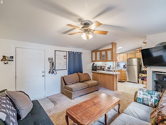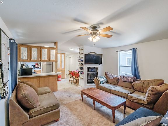 Simple, functional living in a quiet setting. Tucked into a well-maintained, all-ages park, this 3-bedroom, 2-bath home features an electric fireplace and electric forced-air heating for year-round comfort. The community is pet-friendly and includes a picnic and BBQ area, a ball court, and a playground. Conveniently located within a reasonable distance to town and commuting routes, this property is a solid option for anyone looking to downsize, purchase their first home, or find an accessible entry into homeownership. Carpet allowance with an accepted offer!