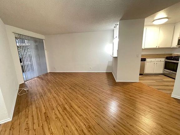 This is a first-floor unit with a private patio. The apartment includes one bedroom and one bathroom, available on a one-year lease with a one-month deposit on approved credit. Cats and dogs are welcome with certain restrictions. Shared laundry facilities are located on-site. Assigned tandem parking is available for an additional monthly fee.