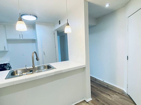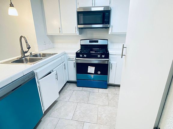 The kitchen is newly updated and includes tile flooring, white tile countertops, a stainless steel sink with a tall spout faucet, pendant lighting, ample cabinet space, and stainless steel appliances including a gas stove/oven, dishwasher, and over-the-range microwave.