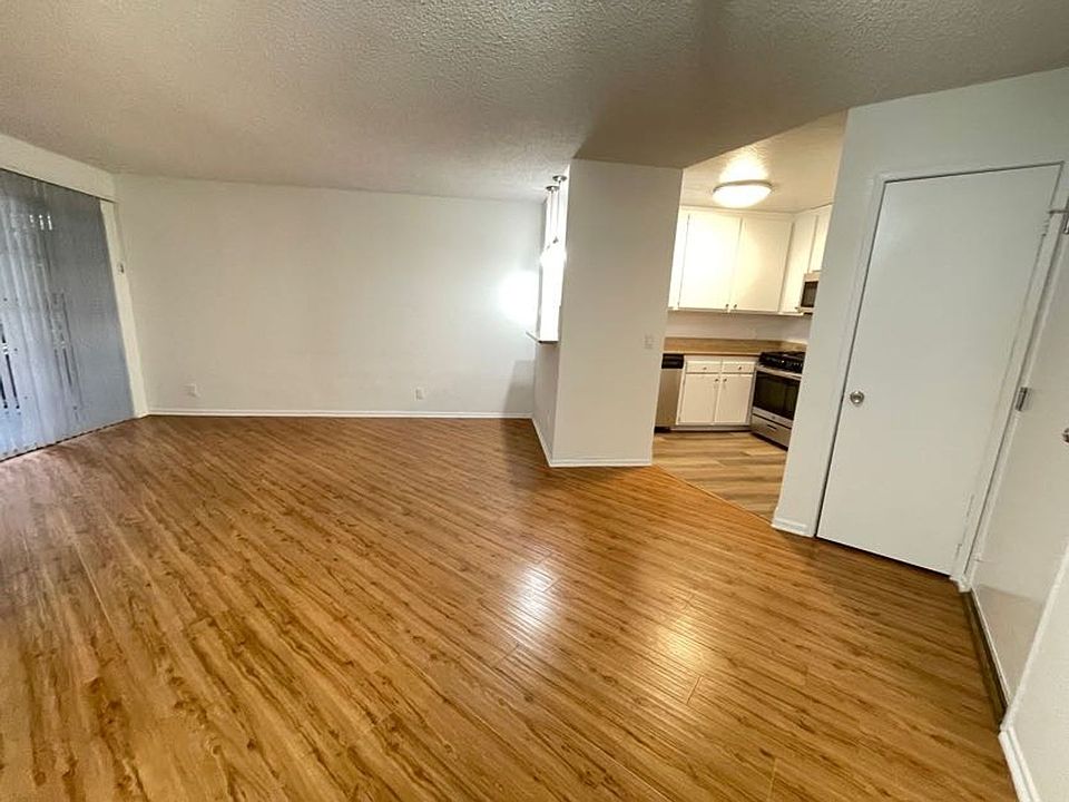Additional highlights include wood flooring throughout the living areas and bedroom, tile flooring in the kitchen and bathroom, and one assigned tandem parking space for two cars in the gated lot (additional monthly fee applies). Laundry facilities are available on site, and the community offers excellent amenities such as a swimming pool, outdoor Jacuzzi, barbecue area, small gym, and landscaped outdoor spaces.