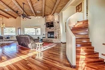 Stone fireplaceExtended covered patioPool or spaSplit floor planExposed beam ceilingPlethora of windowsExpansive kitchen