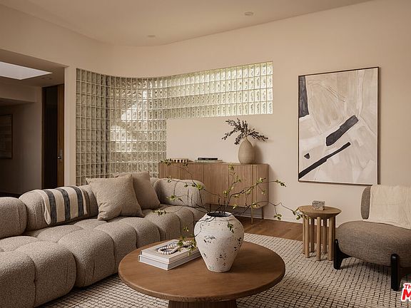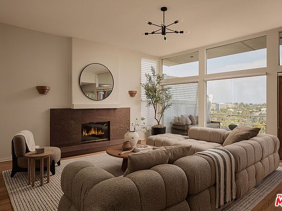Poised high in the hills south of the boulevard, this two-story modern retreat captures sweeping valley views and a timeless architectural sensibility. Defined by clean lines, natural light, and subtle mid-century undertones, the home's airy interior unfolds through a sequence of glass-lined rooms that blur the boundary between indoors and out. Skylights illuminate the open living area where a statement fireplace anchors the space, while walls of glass open to a generous wraparound deck -- an idyllic perch for gatherings, morning coffee, or watching the sunset over the treetops.The kitchen enjoys an abundance of light and connection to the landscape, complete with stainless steel appliances, a breakfast bar, and a cozy lounge framed by panoramic vistas. A separate dining area creates an elegant setting for entertaining. The primary suite, located on the lower level, is exceptionally spacious and serene, complete with its own fireplace and private balcony terrace. Its ensuite bath features a soaking tub set before a large picture window that captures remarkable views -- transforming everyday moments into something extraordinary. With a two-car garage, ample driveway, and close proximity to Warner Center's dining, shopping, and cultural offerings, this residence blends ease, comfort, and contemporary appeal in a coveted hillside location.
