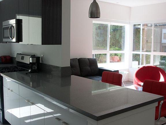 Quartz countersStainless steel appliancesEngineered hardwood flooringModern kitchenIn-home washer and dryer